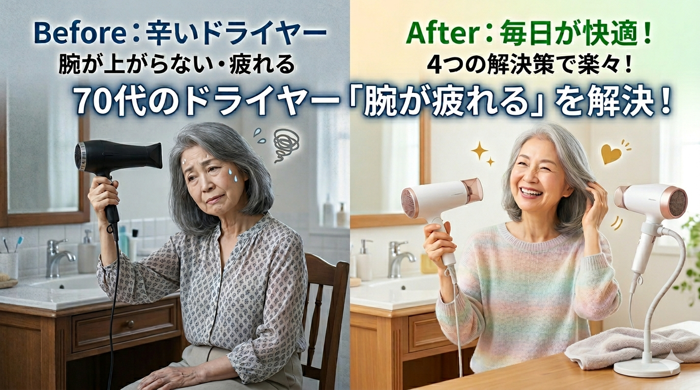 洗髪後のドライヤーは毎日欠かせないケアですが、「腕が疲れる」「腕が上がりにくい」という悩みを抱える70代の方は少なくありません。そこで今回は、ドライヤーの負担を減らすためのかんたん解決策を5つご紹介します😊